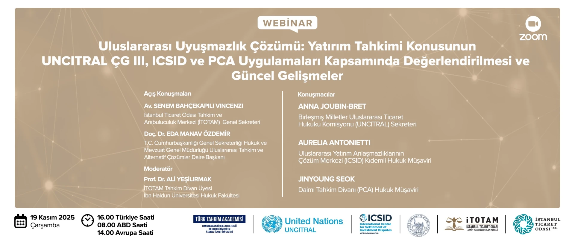 İTOTAM ve Türk Tahkim Akademisi (T.C. Cumhurbaşkanlığı Genel Sekreterliği, İbn Haldun Üniversitesi ve İstanbul Ticaret Üniversitesi iş birliğinde kurulan) iş birliği ile, 19 Kasım 2025 Çarşamba günü Türkiye saati ile 16:00’da (ABD saati ile 08:00’de, Avrupa saati ile 14:00’de) “Uluslararası Uyuşmazlık Çözümü: Yatırım Tahkimi Konusunun UNCITRAL ÇG III, ICSID ve PCA Uygulamaları Kapsamında Değerlend...
