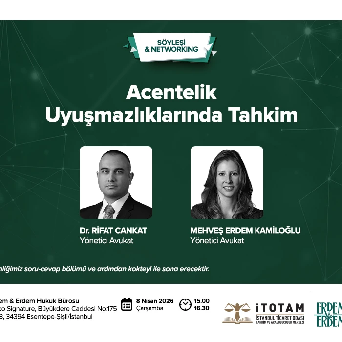 Dr. Rifat Cankat ve Mehves Erdem Kamiloğlu’nun konuşmacı olarak yer alacağı etkinlikte, acentelik ilişkilerinden doğan uyuşmazlıkların tahkim yoluyla çözümüne ilişkin hem teorik hem de pratik yaklaşımlar ele alınacaktır.