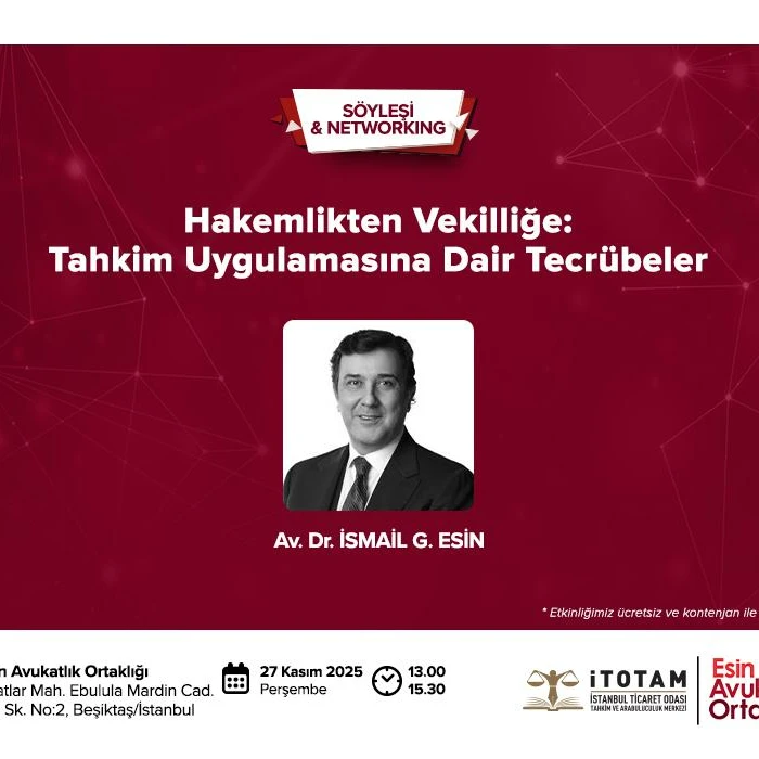 Genç İTOTAM ile Esin Avukatlık Ortaklığı iş birliğinde, 27 Kasım 2025 tarihinde “Hakemlikten Vekilliğe, Tahkim Uygulamasına Dair Tecrübeler” konulu akademik networking etkinliği gerçekleştirilecektir. Av. Dr. İsmail Esin tarafından tahkimde ve hakemliğe ilişkin deneyimlerin ele alınacağı etkinlik, avukatlar ve genç hukukçular için hem bilgi paylaşımı hem de mesleki network imkânı sunmayı amaçlamaktadır.