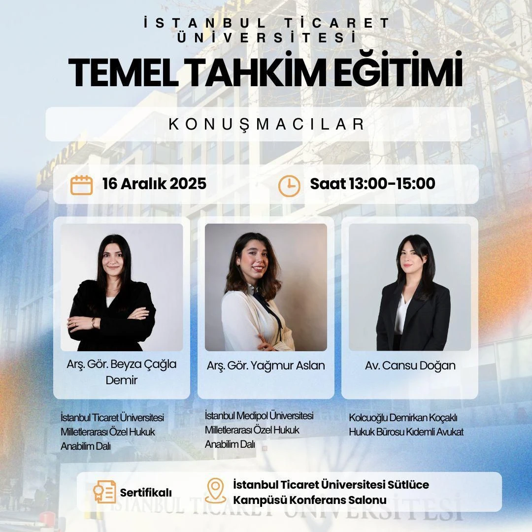 Genç İTOTAM tarafından İstanbul Ticaret Üniversitesi’nde 16 Aralık 2025 tarihinde “Temel Tahkim Eğitimi” konulu akademik etkinlik gerçekleştirilecektir.