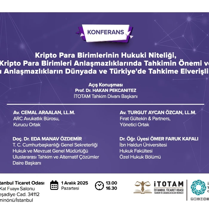 İstanbul Ticaret Odası Tahkim ve Arabuluculuk Merkezi (İTOTAM) tarafından, 1 Aralık 2025 Pazartesi günü 13:00-16:30 saatleri arasında İTO Fuaye Salonu’nda (5. Kat) “Kripto Para Birimlerinin Hukuki Niteliği, Kripto Para Birimleri Anlaşmazlıklarında Tahkimin Önemi ve Bu Anlaşmazlıkların Dünyada ve Türkiye'de Tahkime Elverişliliği” konferansı gerçekleştirilecektir.