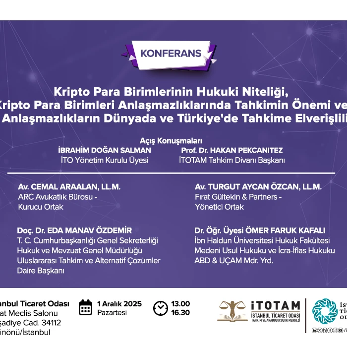 İstanbul Ticaret Odası Tahkim ve Arabuluculuk Merkezi (İTOTAM) tarafından, 1 Aralık 2025 Pazartesi günü 13:00-16:30 saatleri arasında İTO Fuaye Salonu’nda (5. Kat) “Kripto Para Birimlerinin Hukuki Niteliği, Kripto Para Birimleri Anlaşmazlıklarında Tahkimin Önemi ve Bu Anlaşmazlıkların Dünyada ve Türkiye'de Tahkime Elverişliliği” konferansı gerçekleştirilecektir.
